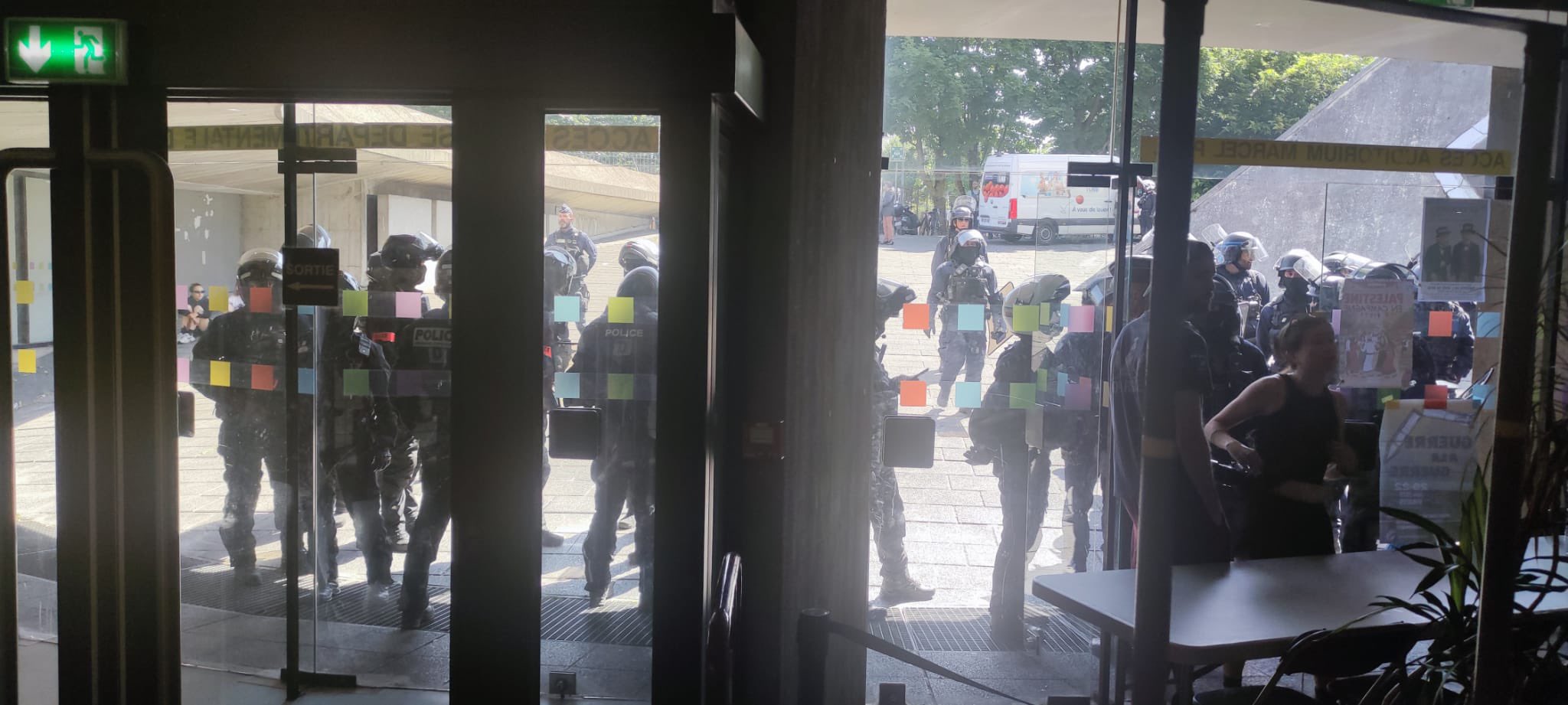 Paris - A counter protest conference to an arms fair at Le Bourget, which hosts Israeli companies, was raided by French riot police this morning in an attempt to intimidate and stop discussions on Islamophobia and anti-Zionism. The raid carried out by riot police under the pretext of arresting specific individuals, was executed with overwhelming force as clear act of intimidation and psychological warfare targeting of the anti genocide movement in France.