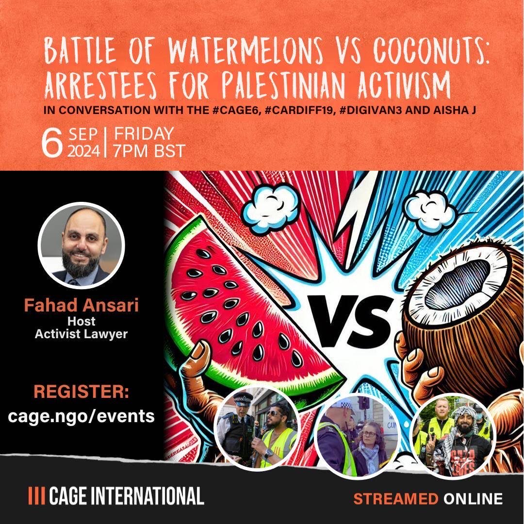 This unique event brings together survivors, all arrestees awaiting a decision from the police or the CPS in conversation with one another, #CAGE6, #Cardiff19, #Digivan3 and Aisha J. Whilst the crime of supporting, aiding and funding genocide has continued for almost a year without a single arrest, communities are criminalised for protesting that same crime.
