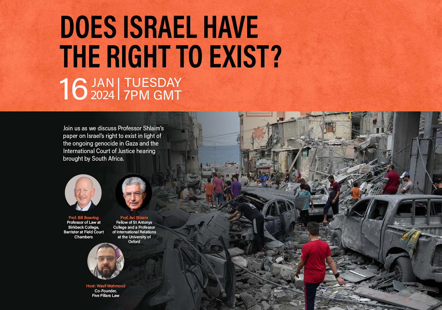 Join Professors Avi Shlaim and Bill Bowring on the 16th of Jan at 7pm as we discuss the ongoing genocide in Gaza, the ICJ hearing on the case brought by South Africa against Israel's war crimes and explore Professor Avi Shlaim's paper on Israel's right to exist, hosted by Wasif Mahmood.